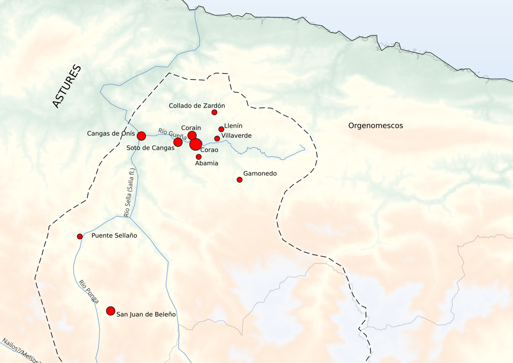 Algo más se puede decir sobre los espacios funerarios, las necrópolis. Es evidente que el hallazgo de un conjunto de estelas indica la existencia de un cementerio e indirectamente la existencia de una zona de hábitat. Sin embargo, carecemos de información precisa sobre las necrópolis porque ninguna de ellas ha sido excavada. Tampoco contamos con información indirecta porque la mayoría de las inscripciones han sido hallada fuera de contexto, es decir, movidas de su lugar primario. Quizás algunas de ellas puedan apuntar hacia un espacio funerario, como por ejemplo las de Coraín y las de Soto de Cangas, pues todas ellas fueron descubiertas por labradores cuando araban sus tierras. Otro indicio de áreas funerarias muy interesante lo proporcionan las estelas halladas junto a la iglesia de Abamia, a la capilla de Santa Cruz de Cangas de Onís o a la capilla de Santa Marina de Gamonedo, pues repiten el mismo patrón de hallazgos epigráficos vinculados a un templo cristiano, en lo que es un claro fenómeno de cristianización de espacios sagrados paganos.