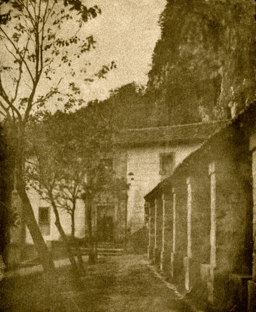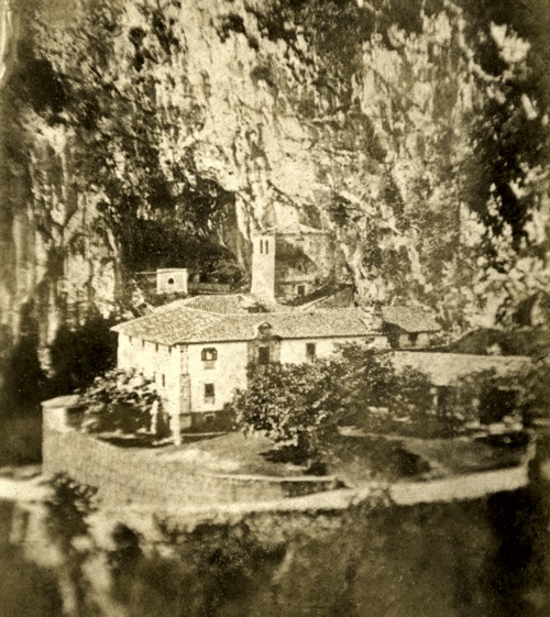 En la explanada que hay delante de la entrada principal puede verse un pequeño campo en el que hay plantados algunos árboles que ocultan parcialmente un cobertizo mientras que al fondo de la terraza que rodea el edificio, por su parte izquierda, aún se aprecia el pequeño osario del desaparecido cementerio. En el extremo derecho, al lado del camino, se vislumbra el canapé del abad Campomanes. En una copia de esta fotografía, publicada por Luis Menéndez Pidal (La Cueva de Covadonga, Madrid, 1956, p. 129), se aprecia con mayor claridad.