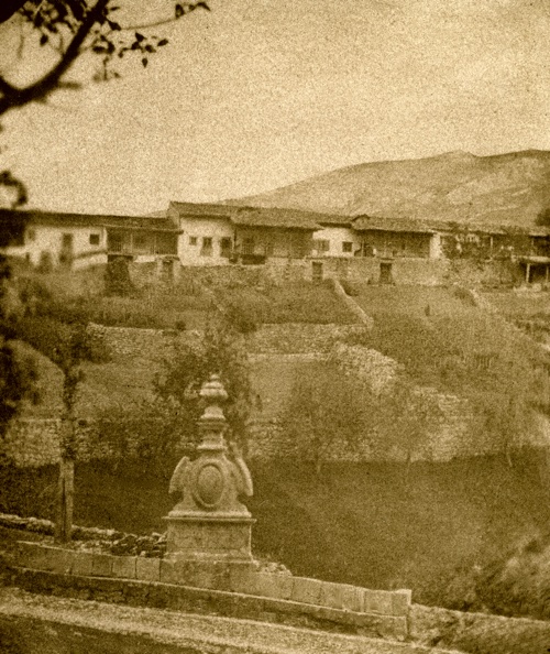 Tomada desde la explanada que hay delante de la entrada de la colegiata en la fotografía pueden apreciarse las huertas existentes frente a las casas de los canónigos, cerradas por unos muros de piedra.
