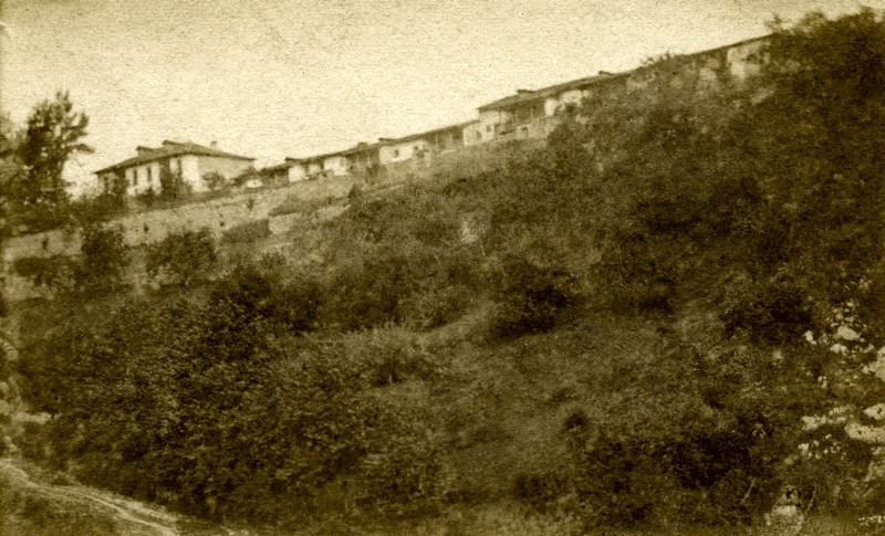En esta inédita vista del Santuario de Covadonga podemos observar cómo eran las antiguas viviendas de los canónigos que el obispo Caballero de Paredes había ordenado levantar en el año 1642.