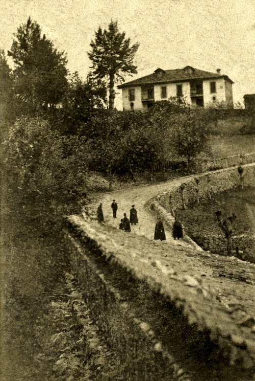 Vista del camino que conduce hasta la parte alta del Cueto; al fondo se ve una gran casona de estilo popular situada junto a la Capilla del Campo y el antiguo cementerio. Cuando Villarmil toma esta vista, desde la parte trasera del cobertizo que había delante de la colegiata, bajan por el camino un grupo de personas, entre ellas varios canónigos que se dirigen hacia la Casa de las Novenas.