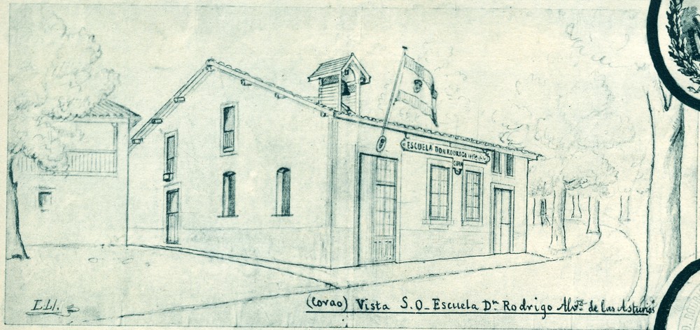 Escuela D. Rodrigo Álvarez de las Asturias, en Corao. Dibujos y fotografía publicados en Recuerdos de Asturias, primera serie, Londres, 1902.