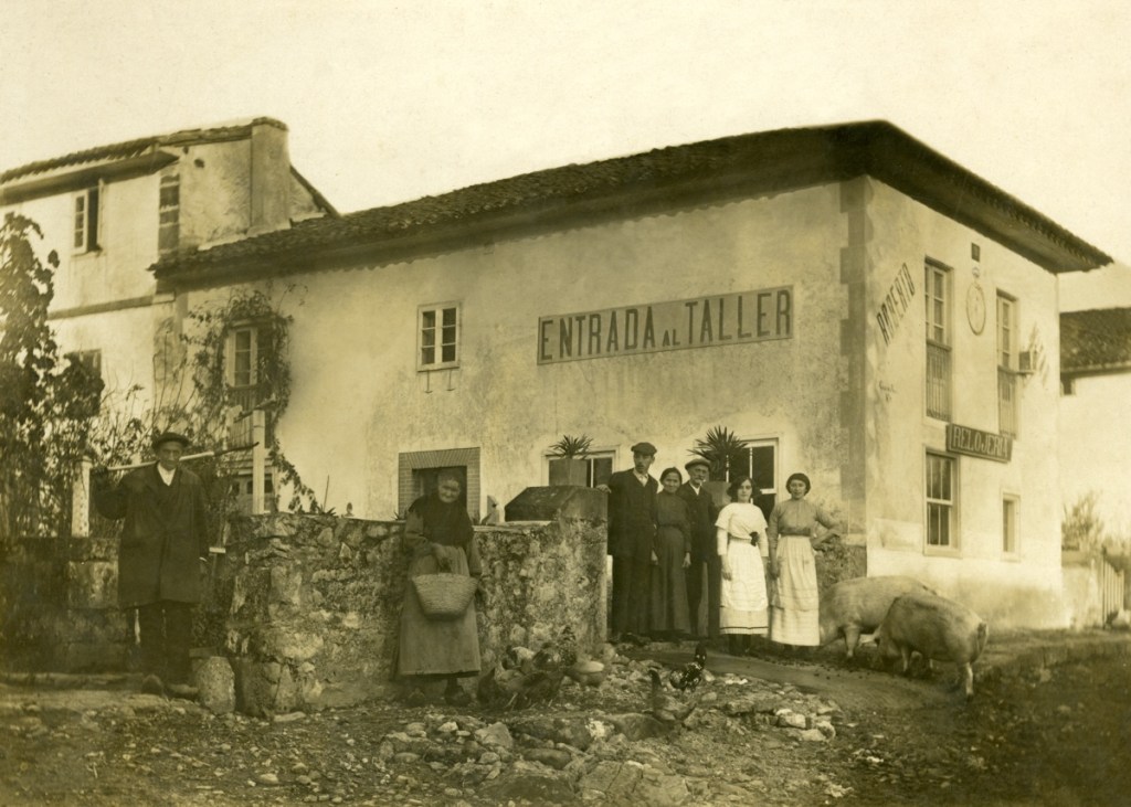En la fotografía observamos a unos vecinos y a la familia de Roberto Miyar casi al completo, solo falta su hija Dosinda que en 1911 había contraído matrimonio con Miguel Dosal. En el grupo, de izquierda a derecha desde nuestra posición, vemos a: Benito, Manuela Díaz Montero (sobrina de Ramona Díaz Mariño, esposa de Roberto Frassinelli), Roberto Miyar Álvarez, Celina y Benjamina, la única de los hijos del matrimonio que no emigró a los Estados Unidos de América. Celina Miyar se casó el 2 de septiembre de 1916 en San Francisco (California) con el tabaquero pongueto Víctor de Diego Traviesa, secretario de la Sociedad Española de Beneficencia y periodista. Benjamina Miyar Díaz, además de ayudar a su padre en la relojería, se desempeñó como fotógrafa, siendo una de las escasas mujeres que se dedicó profesionalmente a la fotografía en Asturias durante el primer tercio del siglo XX.