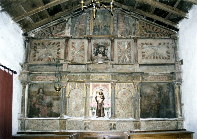 De ella se dice, en el mencionado inventario, que está hecha de piedra, teja, cal y madera, con su campana, y dentro existen un altar y un retablo por dorar, en el que aparecen colocadas las imágenes de San Antonio, Santa Bárbara y San Benito, que es obra de Juan de Berbeo, maestro tallista natural de la ciudad de Oviedo, según consta en el contrato que suscribió el 2 de diciembre de 1760 con los vecinos de Sotu Cangues para la construcción del retablo de San Andrés: “de la misma hechura, tan bien trabajado, limpio y ajustado como el que hizo en la capilla de San Antonio, sita en el lugar de Labra”[8]. Asimismo fue el autor de los retablos de Nuestra Señora de la Visitación, en Parolu, y de San Antonio, en Cangas de Onís.