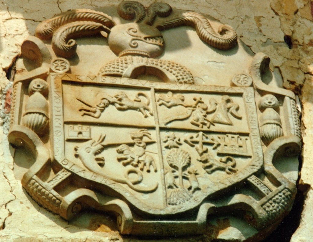 El último de los escudos con las armas de Labra, entre los existentes en Corao Castiellu, es el que figura en la casa de los Fernández del Cueto, fechado en 1676 y dividido en cuatro cuarteles, con las armas de Fernández del Cueto, Noriega, Labra y Arenas. Las armas de Labra, que son idénticas a las de los anteriores, pero en este caso orientadas a la izquierda, figuran en el cuartel inferior izquierdo. En la orla leemos, en la línea superior: “ARMS DEL QVETO Y NORIEGA”; en la inferior: “DE LABRA [deteriorado] ARENAS”; a la izquierda: “AÑO DE 1676”; a la derecha: “PUSOLA DIEGO DE L[ABRA]”[8]. El escribano Diego de Labra, que ejerce a mediados del siglo XVII[9], era hijo de Juan de Noriega de Labra, como él mismo manifiesta en una escritura otorgada junto a la ermita de San Nicolás de Corao el 6 de junio de 1644[10]. Debió nacer en 1614, pues en los padrones de moneda forera del concejo de Cangas de Onís, correspondientes al año 1656 y al tratar sobre el cuarto de Labra, dice tener 42 años[11]. Sería sepultado el 28 de enero de 1682 en el cuerpo principal de la iglesia de Abamia, delante del altar de Nuestra Señora, signo inequívoco de su relevancia social.