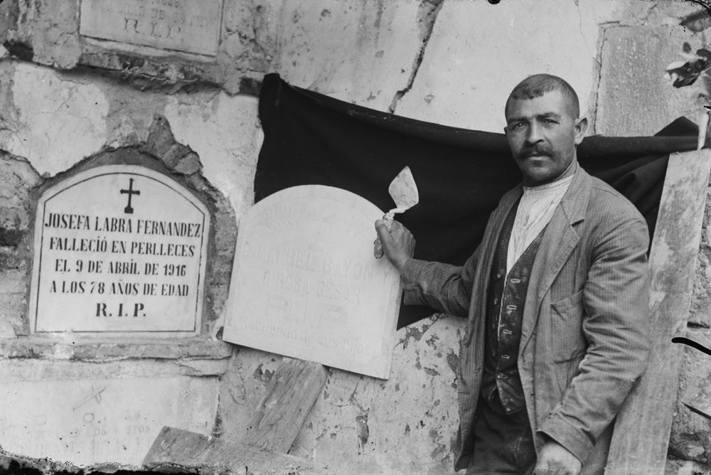 Esta inusual fotografía realizada por Benjamina Miyar nos muestra al enterrador de la parroquia de Santa Eulalia de Abamia en el antiguo cementerio parroquial, situado junto a la iglesia de Abamia. Está colocando una lápida a los difuntos esposos Manuel Bayón González y Rosa César Valle, recuerdo de sus hijos Manuel y Antonio. Manuel Bayón había muerto en Corao el 8 de mayo de 1900, siendo viudo de su esposa, fallecida el 6 de diciembre de 1896.