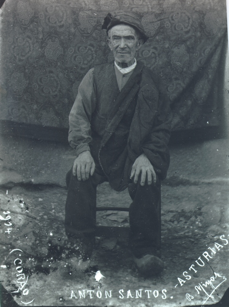 Benjamina Miyar Díaz nació en Corao el 9 de agosto de 1888. Aprovechamos el aniversario para publicar uno de sus primeros retratos, fechado en el año 1914 como se puede comprobar en la propia fotografía. Benjamina logra captar el temple y la recia personalidad de su vecino Antón Santos, que viste a la manera moderna pero aún hace gala de asturianía calzando las tradicionales madreñas y cubriendo la cabeza con la montera picona. En primer plano, unas manos fuertes como símbolos del duro trabajo del campesinado.
