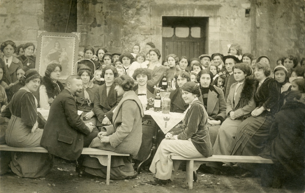 Por otras fotografías, sabemos que las jóvenes situadas en primer plano forman parte de la clase pudiente de la ciudad. Seguramente muchas de estas personas serían miembros de las Hijas de María o de la Cofradía del Sagrado Corazón de Jesús, las asociaciones religiosas más activas en las primeras décadas del siglo XX en Cangas de Onís. Participarían también en la Asociación de Caridad y en el Ropero de los Pobres, sociedades caritativas que aliviaron el sufrimiento de muchas familias en una época caracterizada por la miseria de amplias capas de la población y probablemente su concepción de la sociedad, tan vinculada a la iglesia, chocaría con los movimientos sociales que aspiraban a superar la postración de los pobres con ideas y actitudes alejadas de la doctrina católica.