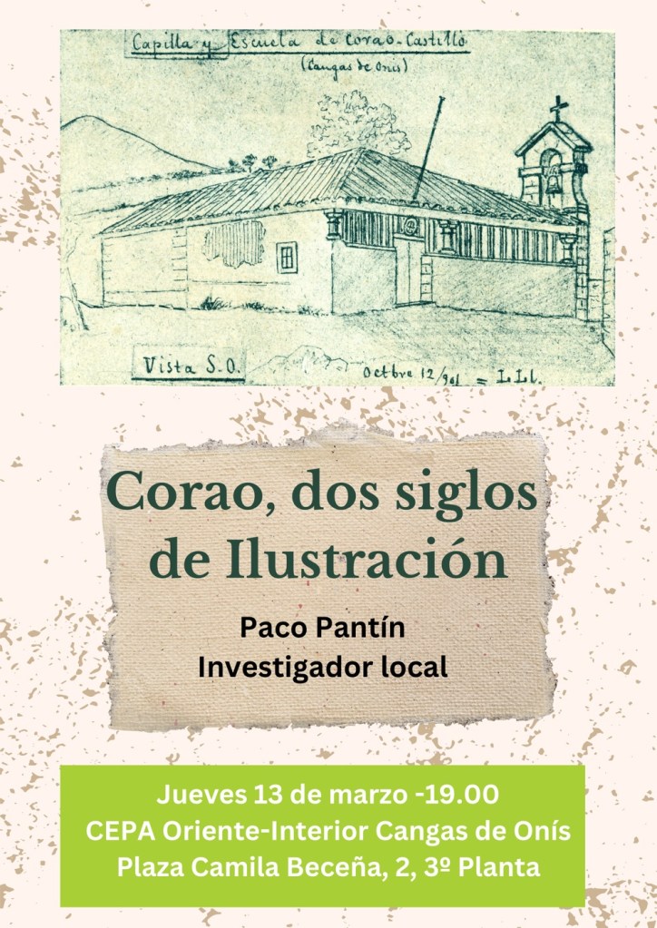 Este próximo jueves, 13 de marzo, a las 19 horas daré una charla en el Centro de educación de personas adultas (CEPA Oriente-Interior) titulada Corao, dos siglos de Ilustración en la que haré una presentación o repaso general de los hitos educativos, culturales y sociales que hicieron de Corao un referente en el mundo de la cultura canguesa y asturiana desde el año 1760, cuando se funda la Escuela de Corao Castiellu hasta el fallecimiento de dos destacadas personalidades, Ángel Sarmiento González y Benjamina Miyar Díaz, a principios de la década de 1960.